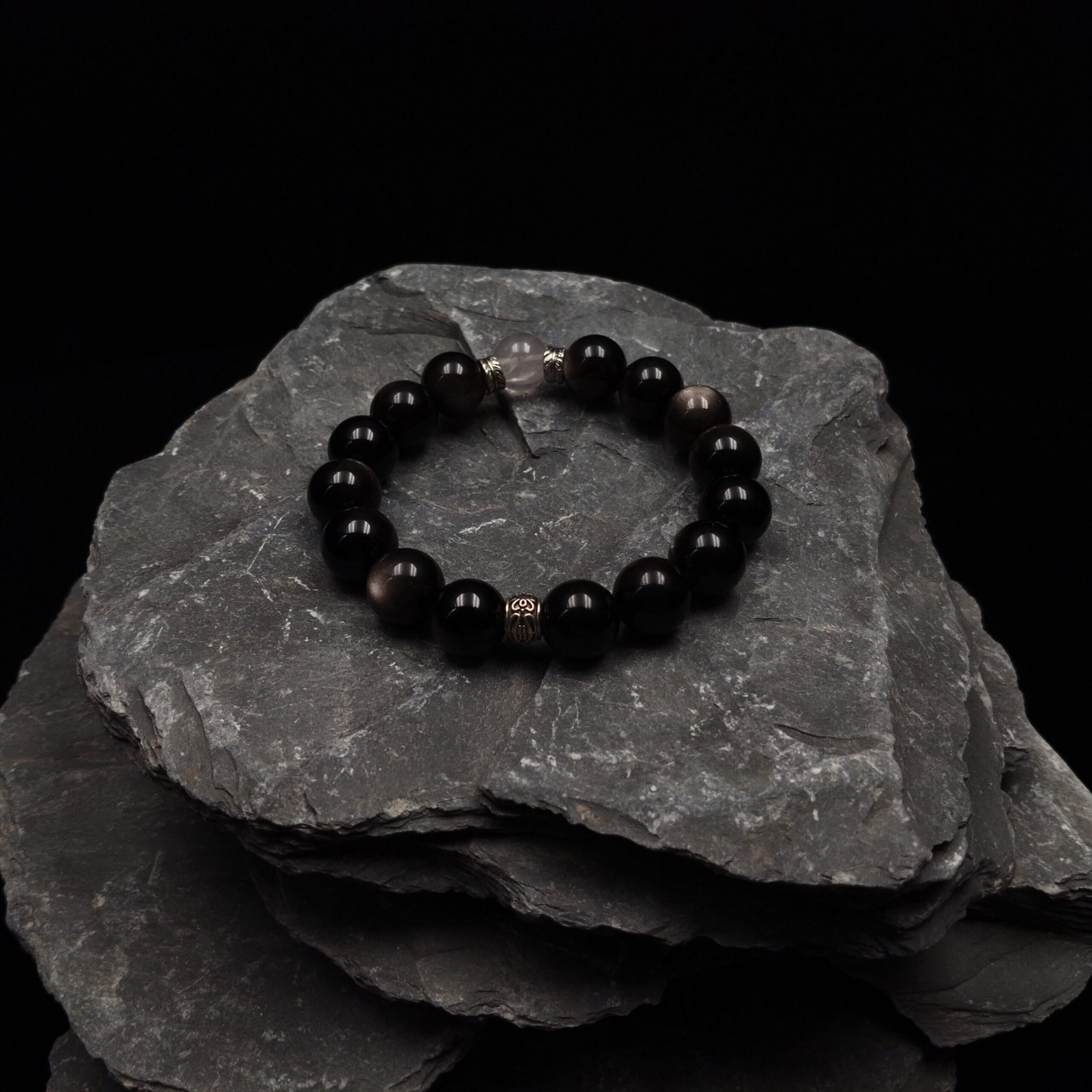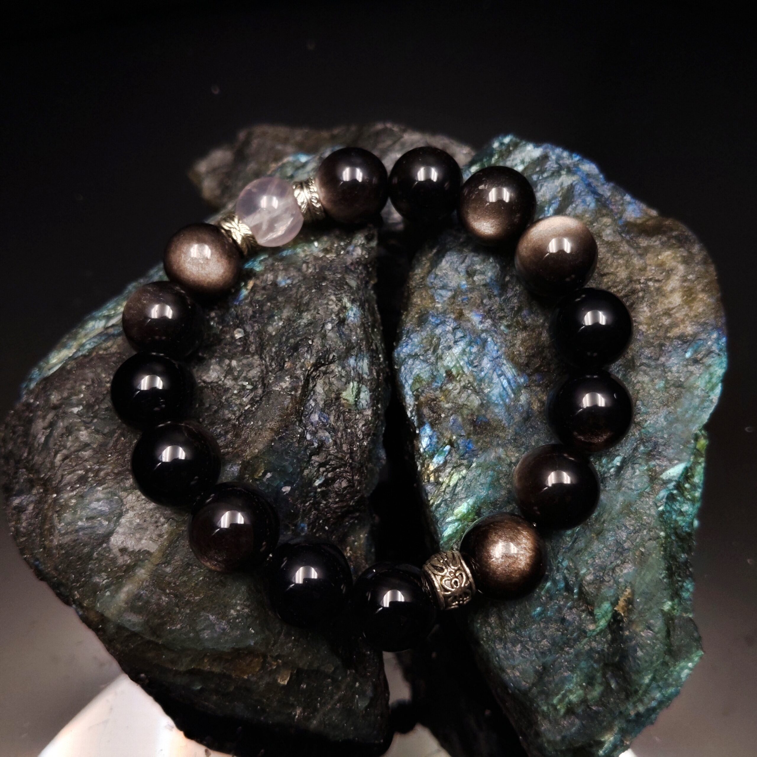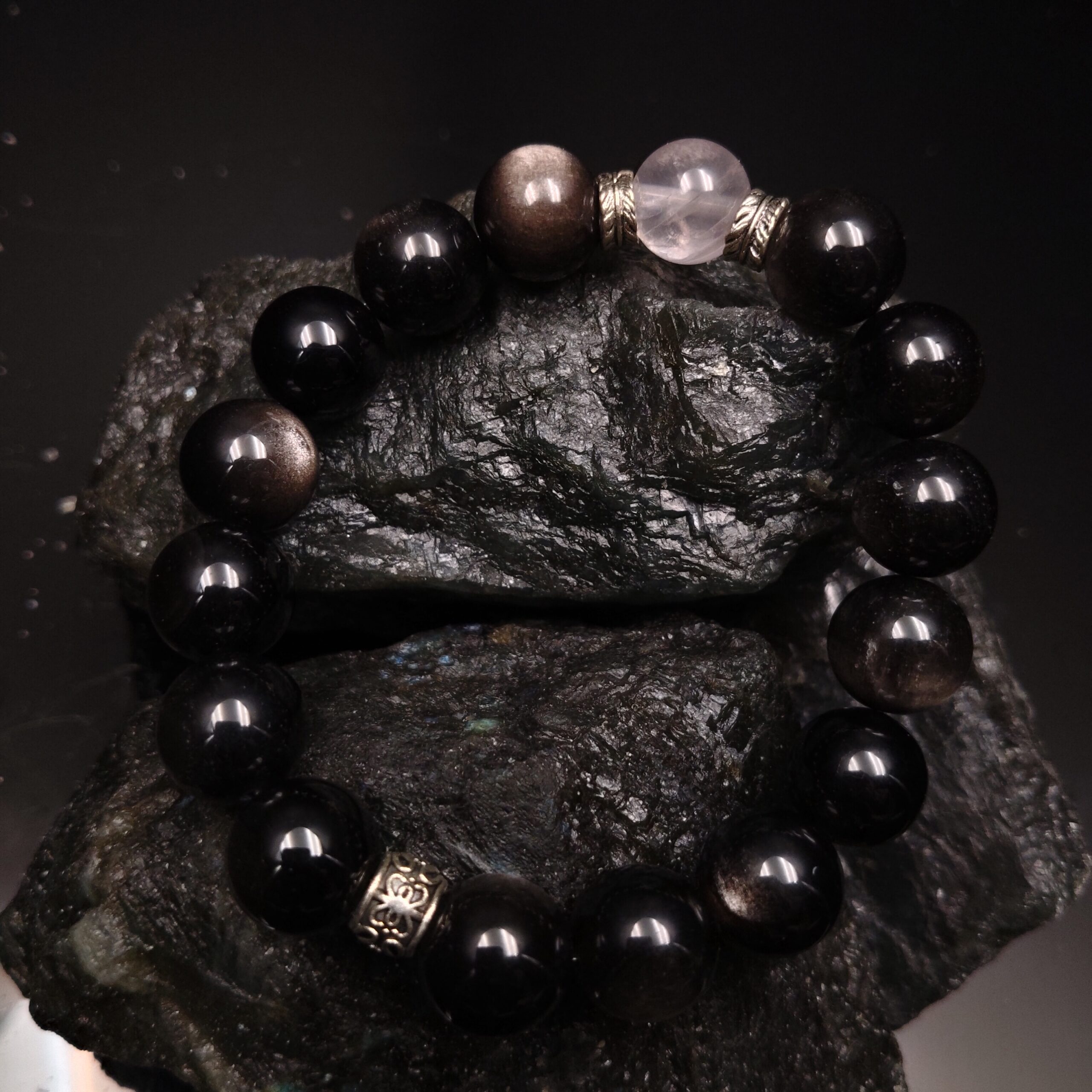 12mm Obsidian, Silver Obsidian, Clear Quartz, 37 grams, 16cm-17cm in diameter