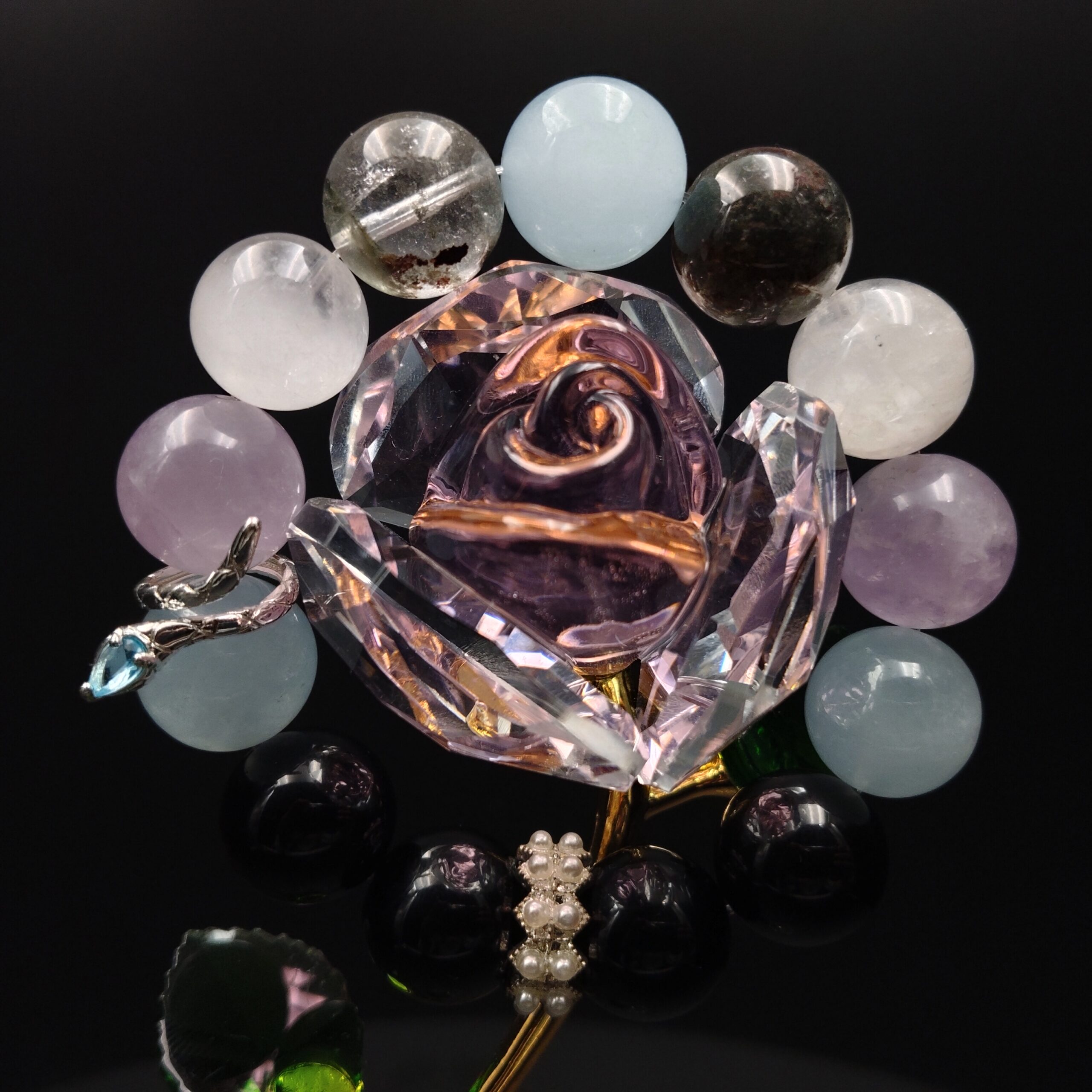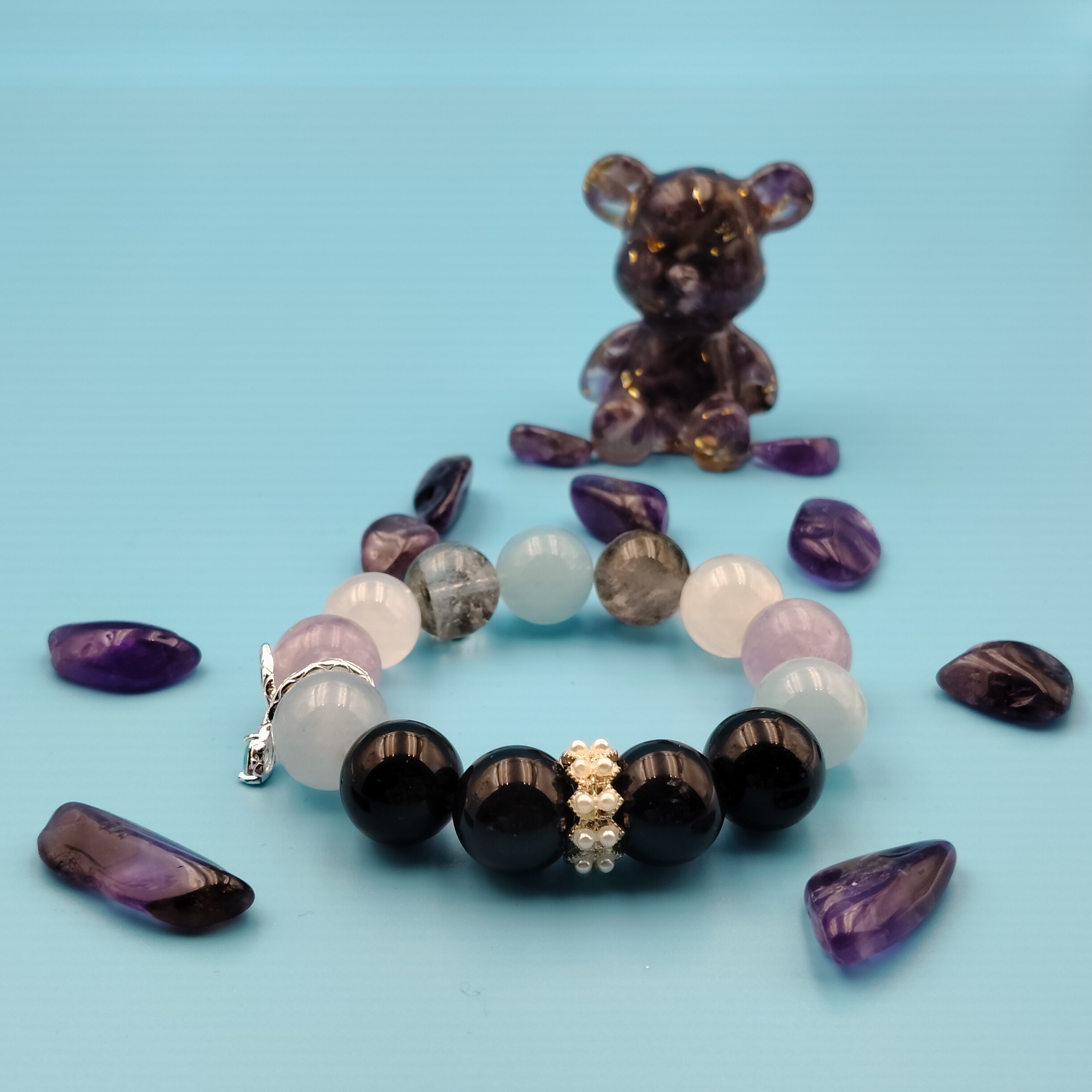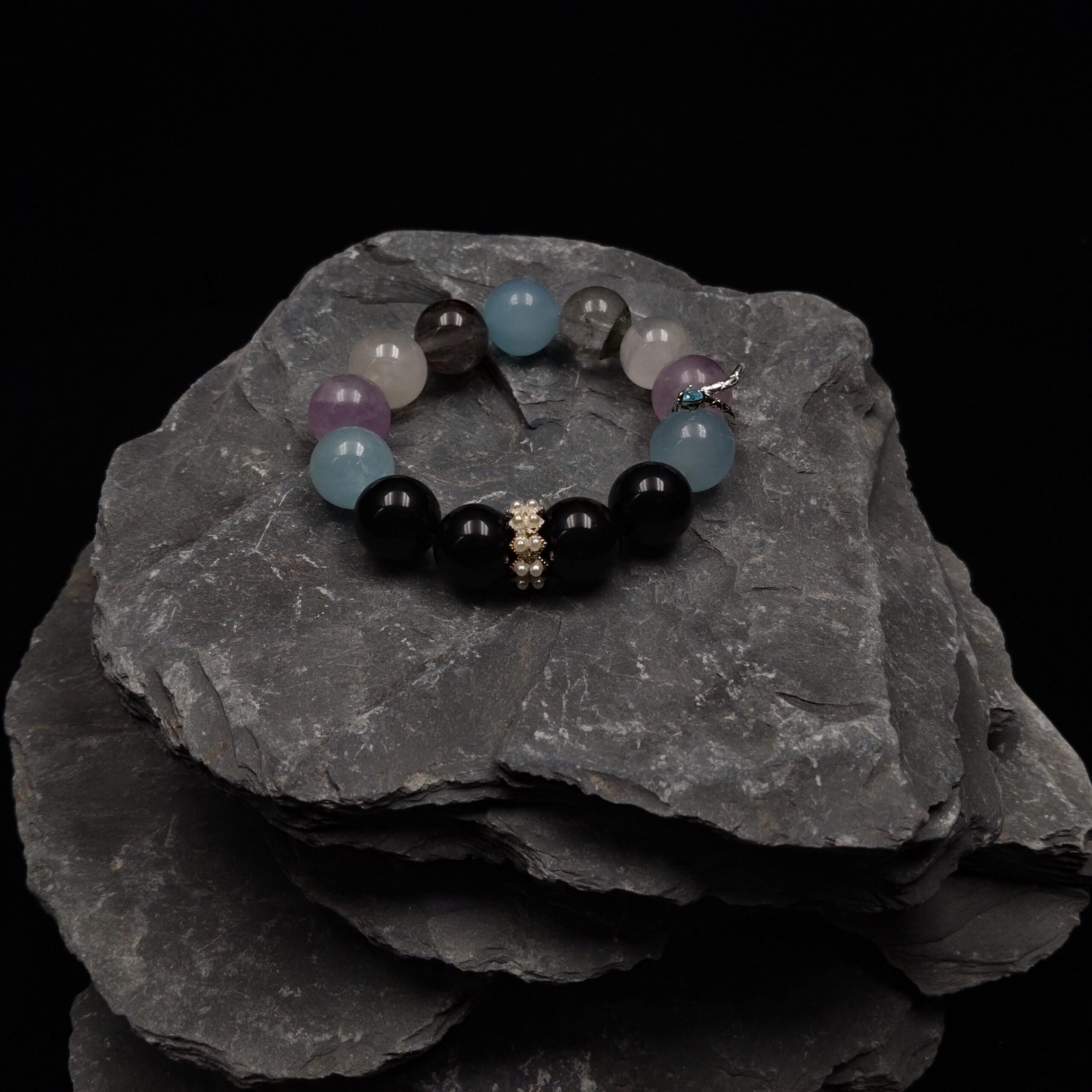 14mm White Phantom Quartz, Green Phantom Quartz, Aquamarine, Lavender Amethyst, Obsidian, 14K Gold Plated Accessory, 52g, 16cm-17cm Inner Diameter